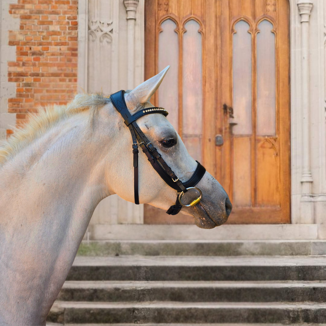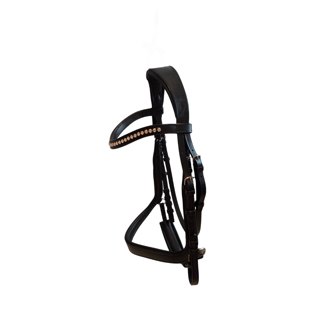 Una cabezada clásica de doma con acolchado se ve hermosa pero se sienta aún mejor. El acolchado suave combinado con los recortes de forma anatómica para las orejas añadirá comodidad y un ajuste fácil . La muserola acolchada pull-back se cierra bien para un ajuste estupendo. Una frontalera hermosa en forma de V tiene una fila de diamantes de imitación de buen gusto para un toque de brillo.